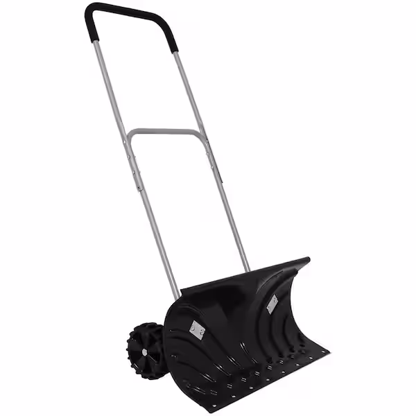 - Aluminum handle with padding, polypropylene wheels and shovel with metal scraping blade