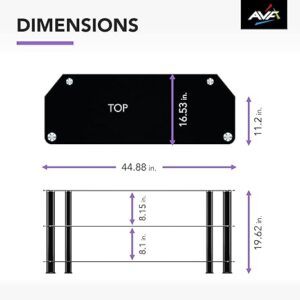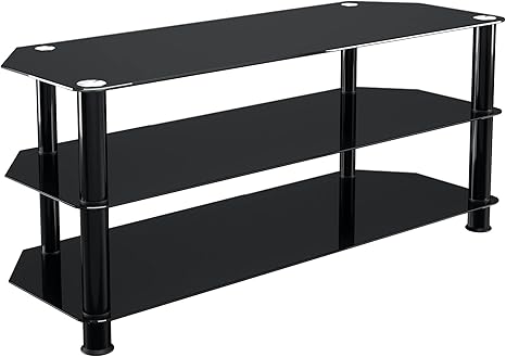 Please Measure your TV Feet Width and Depth to assure fit. Assembled Dimensions (Width x Depth x Height): 44.88” x 16.54” x 19.69”.- Supports TVs up to 99 lbs, plus 44 lbs for Middle & Bottom Black Tempered Glass Shelves