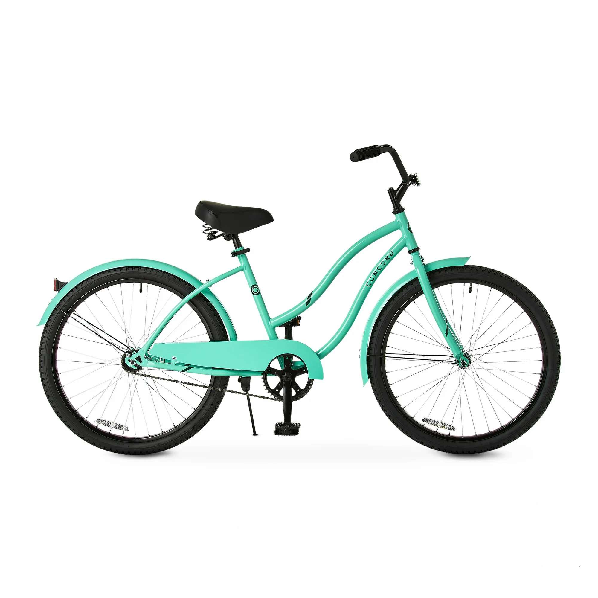 This 24-inch Concord Pacifica cruiser bike for girls offers comfort and style in a sleek package. The pastel green steel frame is simple, yet stylish without sacrificing durability. The padded spring saddle is slightly reclined, with a lower center of gravity, and the raised handlebar lets you ride in a more upright position that’s easier on your back, neck, and legs. With full leg extension while pedaling and the ability to place both feet flat on the ground when stopped, this bike provides excellent balance and control. The coaster brake offers easy stopping, and fenders keep splashes at bay. Dual-density grips and pedals add extra comfort. Cruise on to wherever life takes you next on the Concord Pacifica cruiser. Ideal for ages 12 to 19 years old.