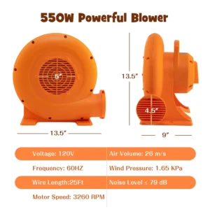 Made of selected PP, the external structure of blower features perfect water resistance. Together with an IPX4, it is suitable for application on wet or rainy days. Even the switch button is fitted with a sealed cover to isolate water. Also, its GFCI power cable is up to 25ft, offering roomy space for moving around. Its strong motor features a high speed of 3260RPM and offers a large volume of 26m/s while it produces lower noises. You can carry the blower easily to inflate your bouncy castle, water slide and holiday inflatable. With included stakes, it will be firmly installed in placed.