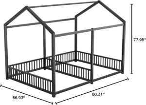 Double Montessori Floor Bed with Fence & Roof for Two Kids Teens Boys Girls,Twin Floor Bed,Easy Assemble,No Box Spring Needed, Black