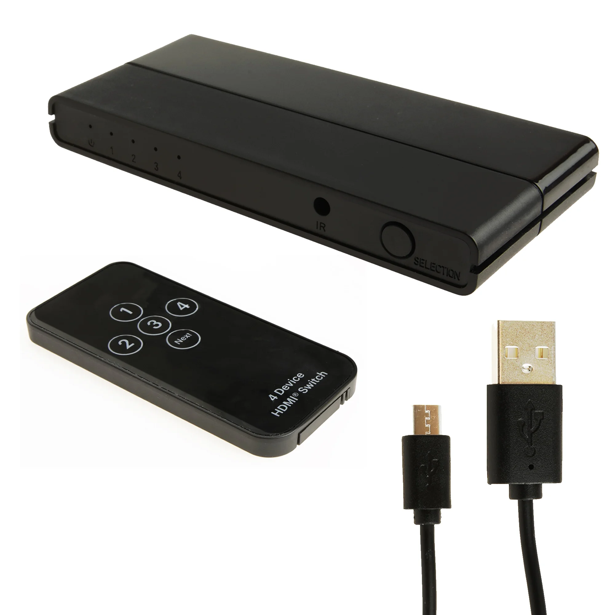 - Included Accessories: Comes with one HDMI 4×1 Switch, a 4 ft (1.2 m) Micro-USB power cable, a wireless IR remote control (with 2 AAA batteries), and a Quick Start Guide.