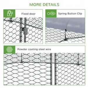 - Safety Design: A lockable door with a latch makes this large chicken coop more safe. The chain link walling features hexagonal mesh wires with a galvanizing technology that’s resistant to wear and rust. The metal wire is treated with a dipping process that ensures protection against injury.