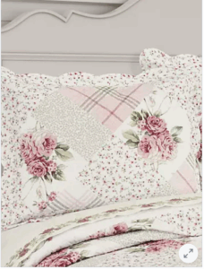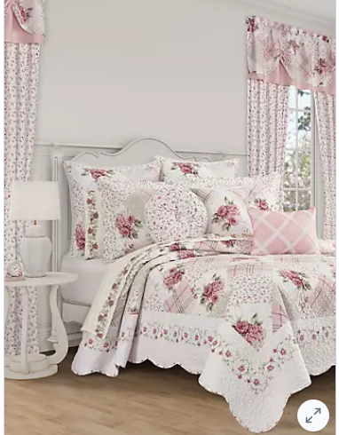 The Bungalow Quilt Collection features a lovely classic patchwork floral design, that creates an atmosphere of vintage elegance and charm. The patchwork print has different shades of pink on a white ground and is also double framed with a delicate scroll and a ditsy floral. The quilt reverses to the matching ditsy floral and is quilted with all-over vermicelli for added quality. The set is paired with shams that are surrounded by a delicate cotton lace and also quilted. This collection is the perfect addition to any home and will give you years of comfort and many complements. Coordinate pillows, shams and window treatments are available (each sold separately).